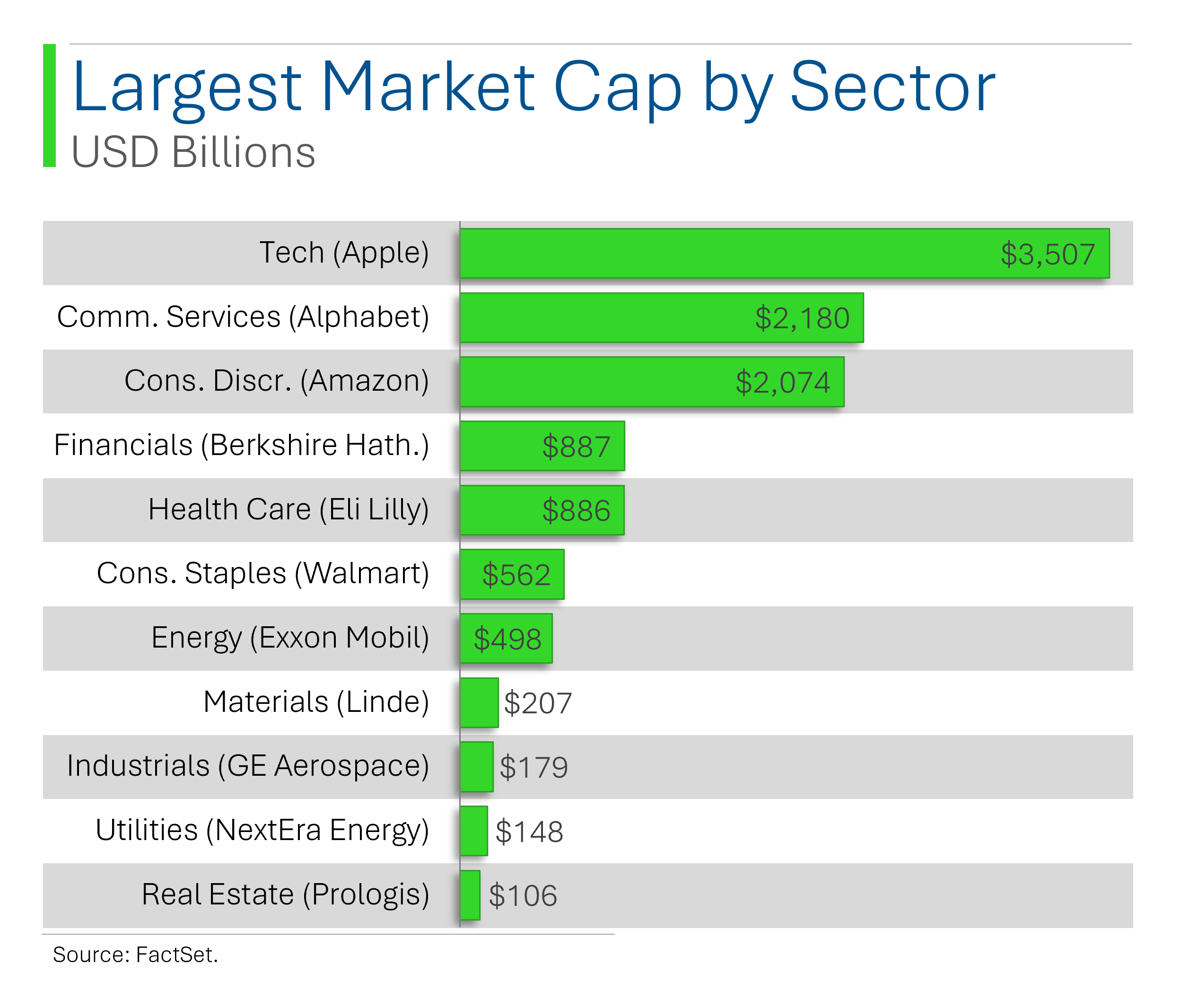 So yeah, not all sectors are created equal. For example, the biggest Tech company, Apple, is roughly 33x bigger than the biggest Real Estate company, Prologis.