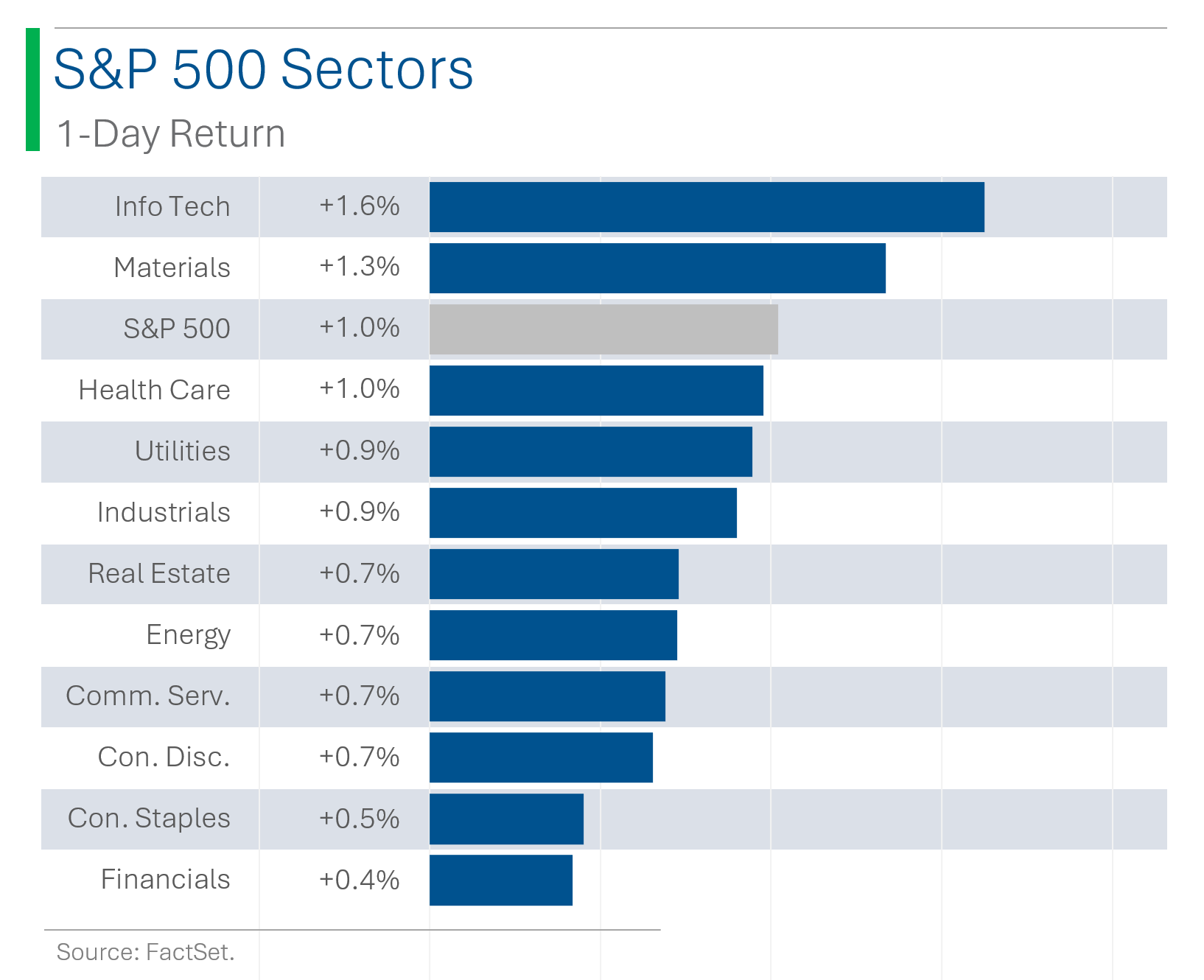 All 11 sectors closed higher with Tech (+1.6%). Financials (+0.4%) and Staples (+0.5%) were the weakest but still had a good day of it.