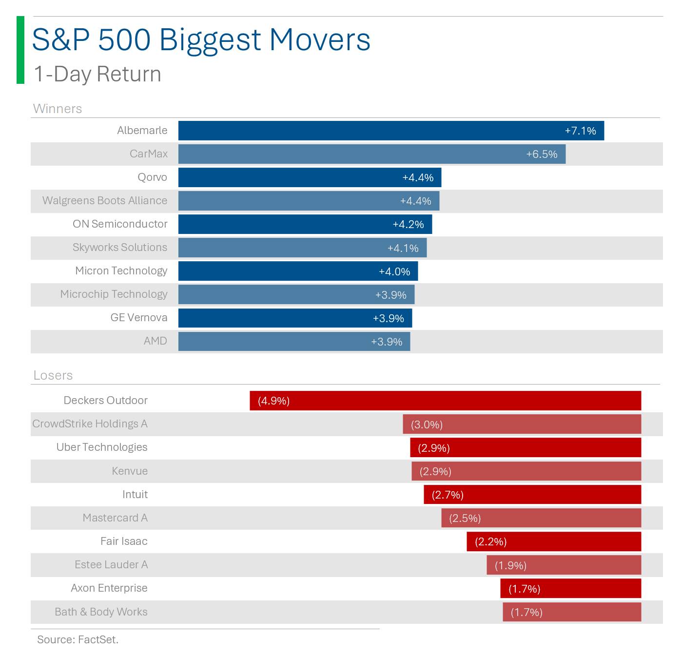 Illumina (ILMN) [+6.1%]: Announced acquisition of Fluent BioSciences; aims to develop end-to-end solutions for single-cell analysis; analysts positive on market expansion; upgraded at Citi.