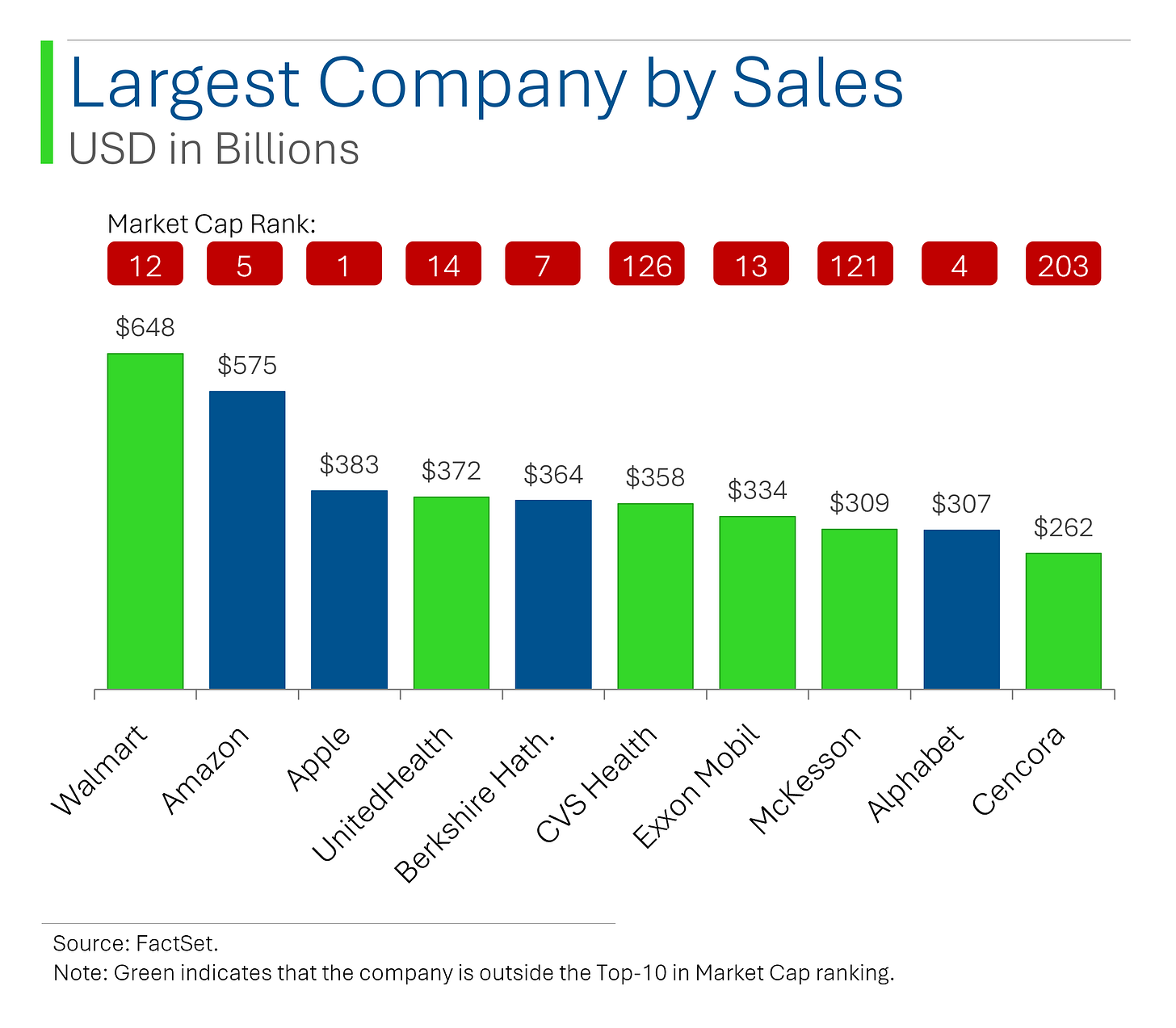 The biggest mismatch here is Cencora (a drug distributor formerly known as AmerisourceBergen) with the 10th highest sales but the 203rd highest market cap.