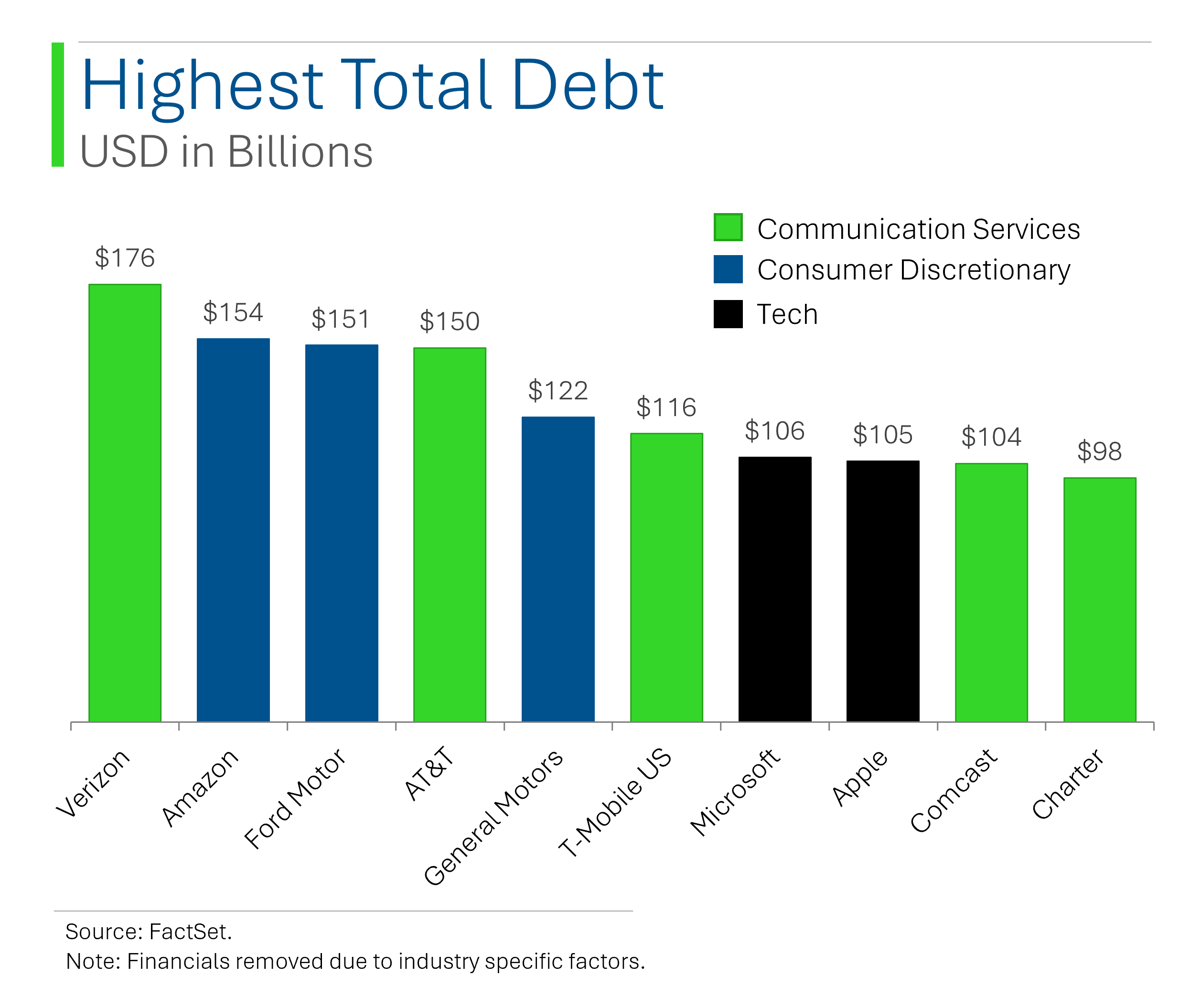 Looking at the highest total debt, this is interestingly occupied entirely by the likes of Communication Services, Consumer Discretionary and Tech companies.