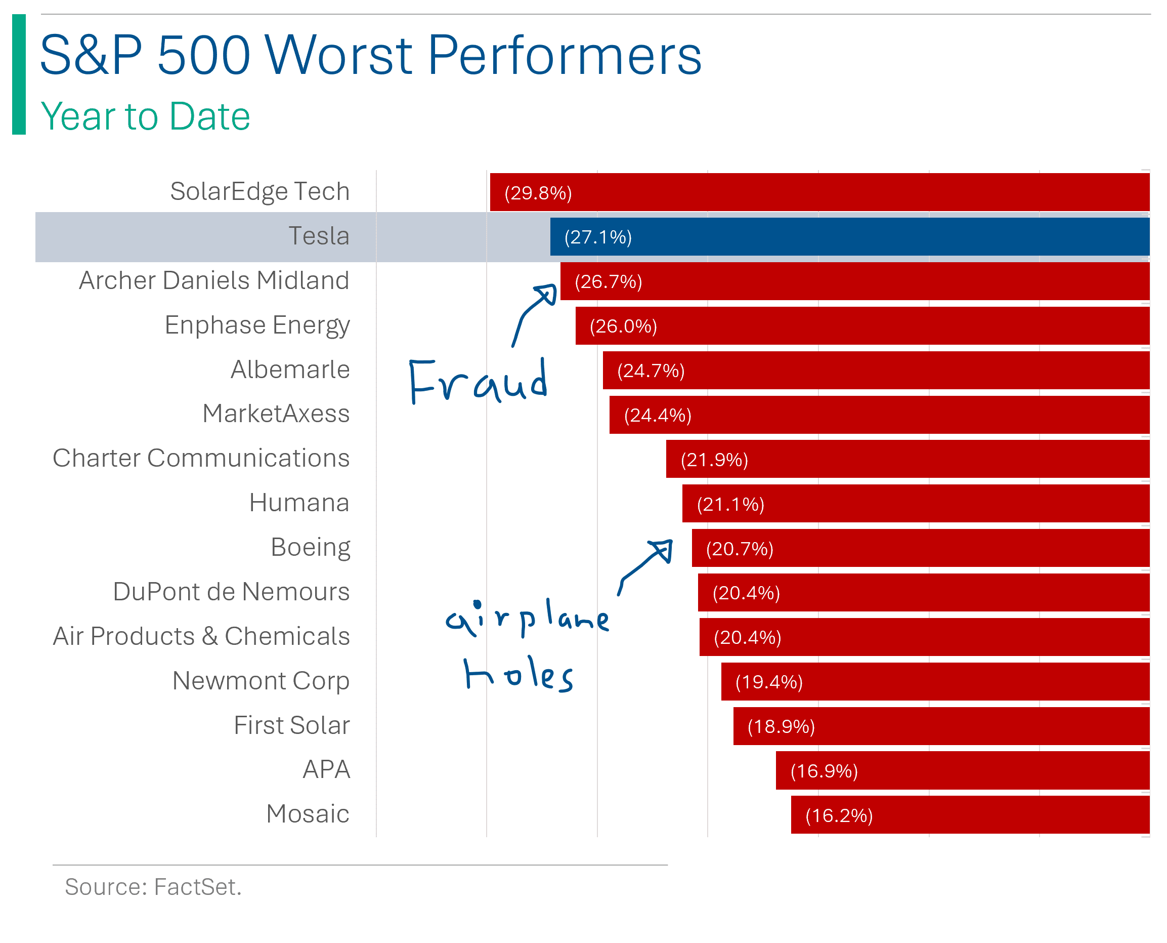 As it stands, Tesla is down 27.1% this year - making it the second worst performer after SolarEdge in the S&P 500 this year. Tesla’s market cap sits at $598 billion, less than half of its $1.2 trillion dollar peak in November 2021.