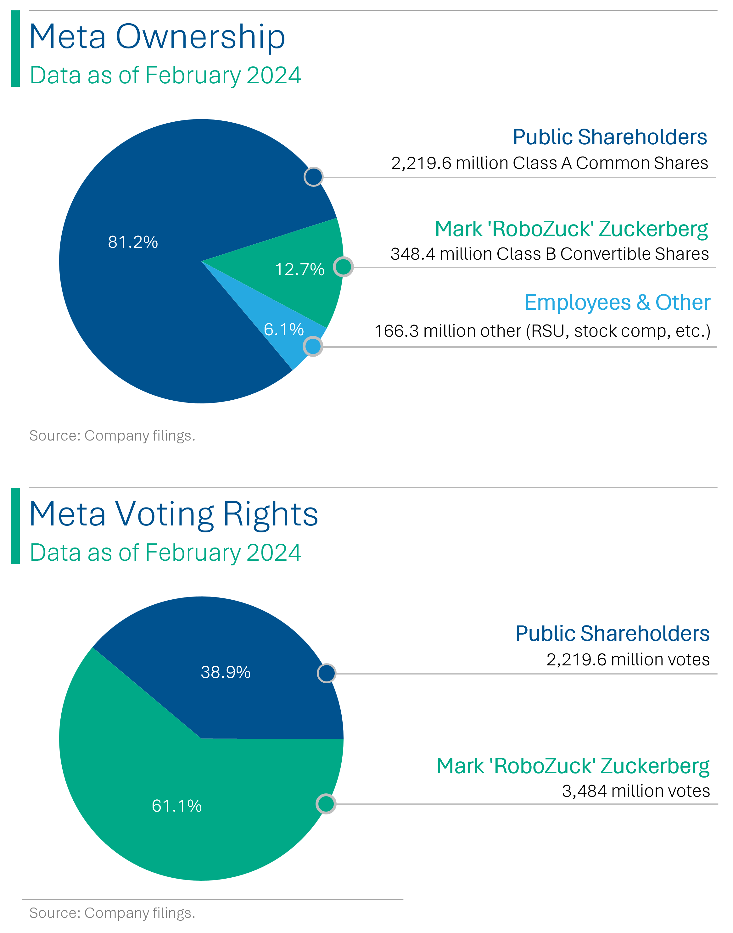 However, I don’t think that is the main reason. As you can see above, Zuckerberg has around 13% of Meta shares but because they are Class B super voting shares, they carry 10 votes per share (versus 1 vote in the Class A’s). This means that he controls about 61% of voting power at Meta - and essentially that he can do whatever he wants.